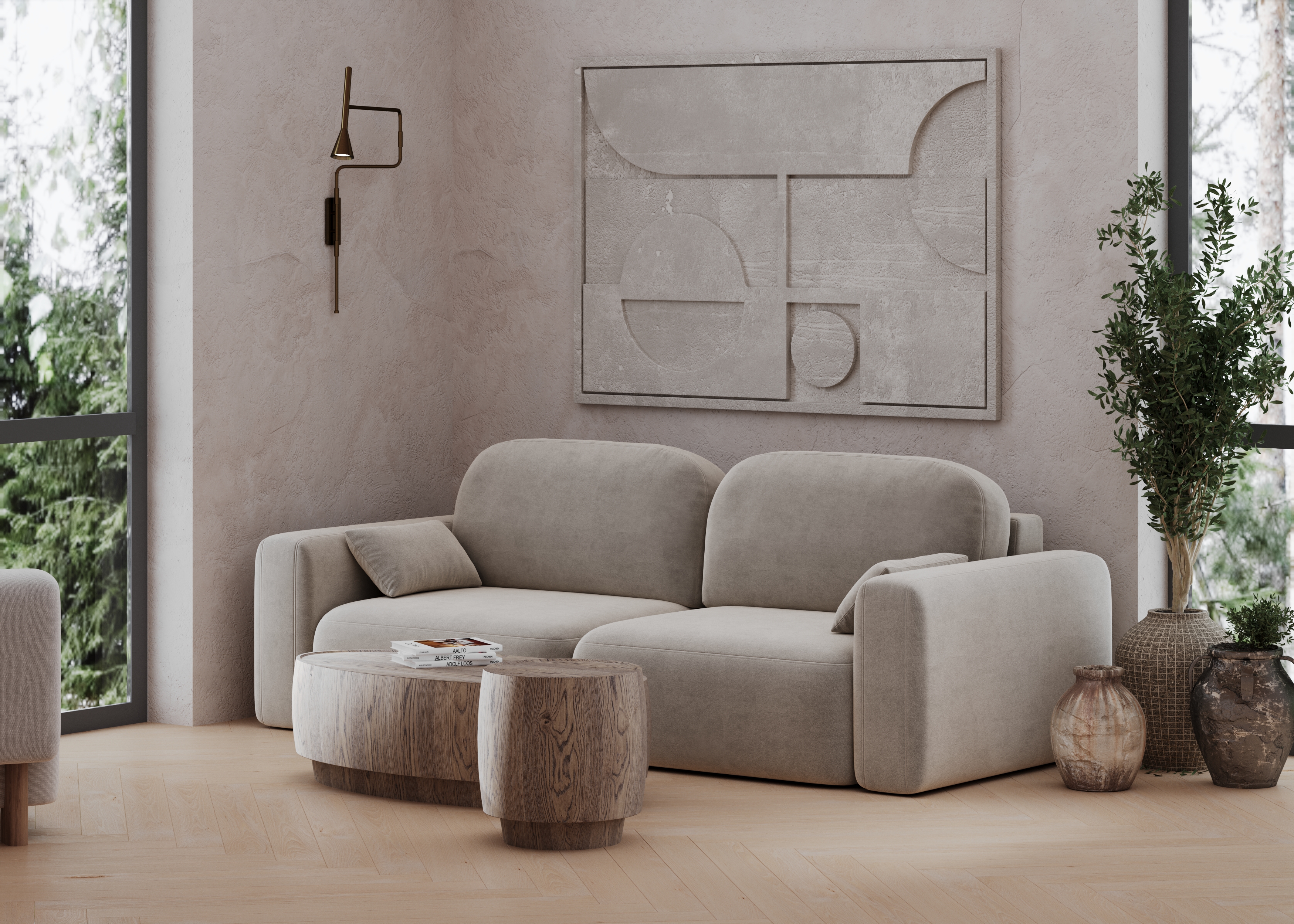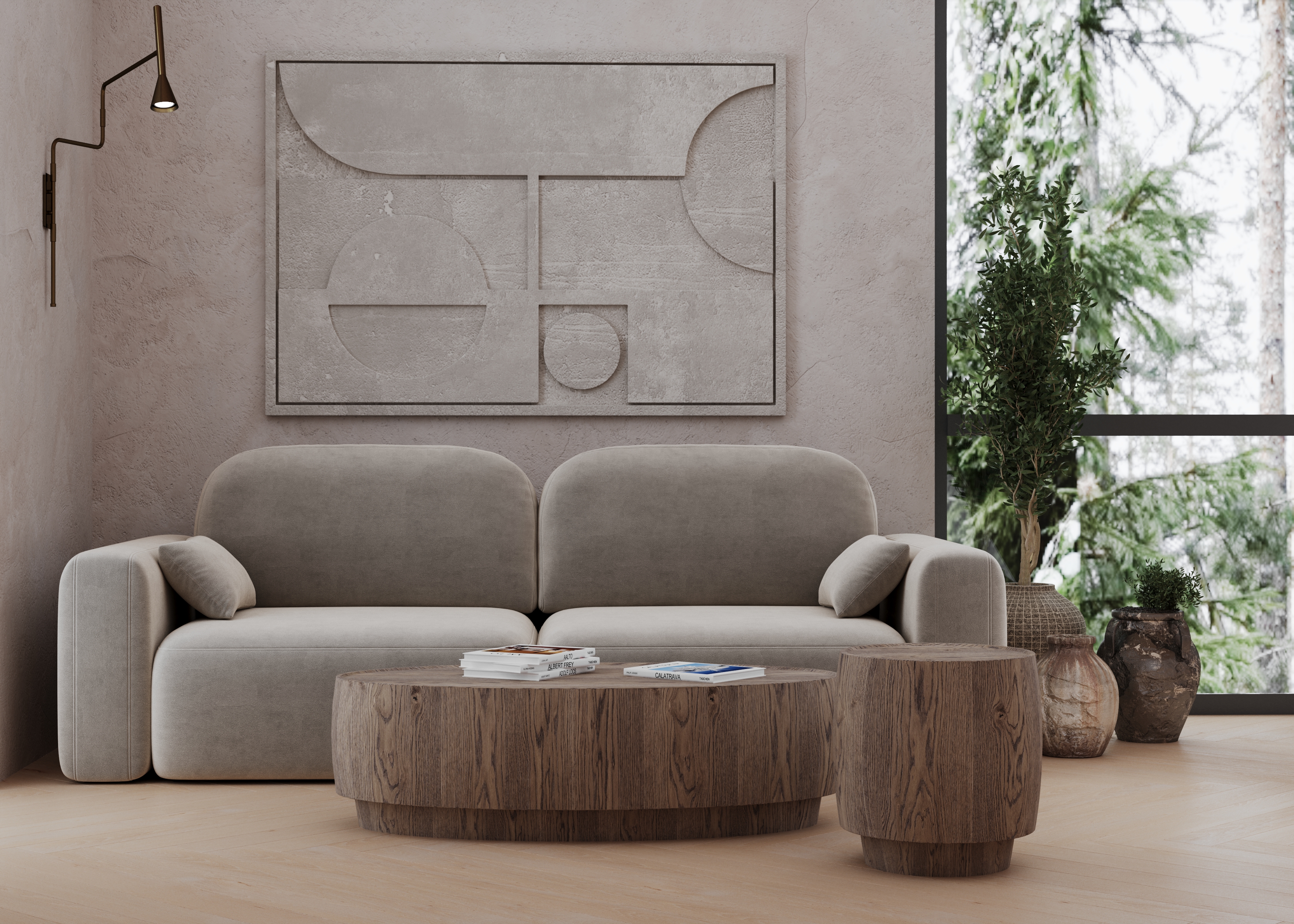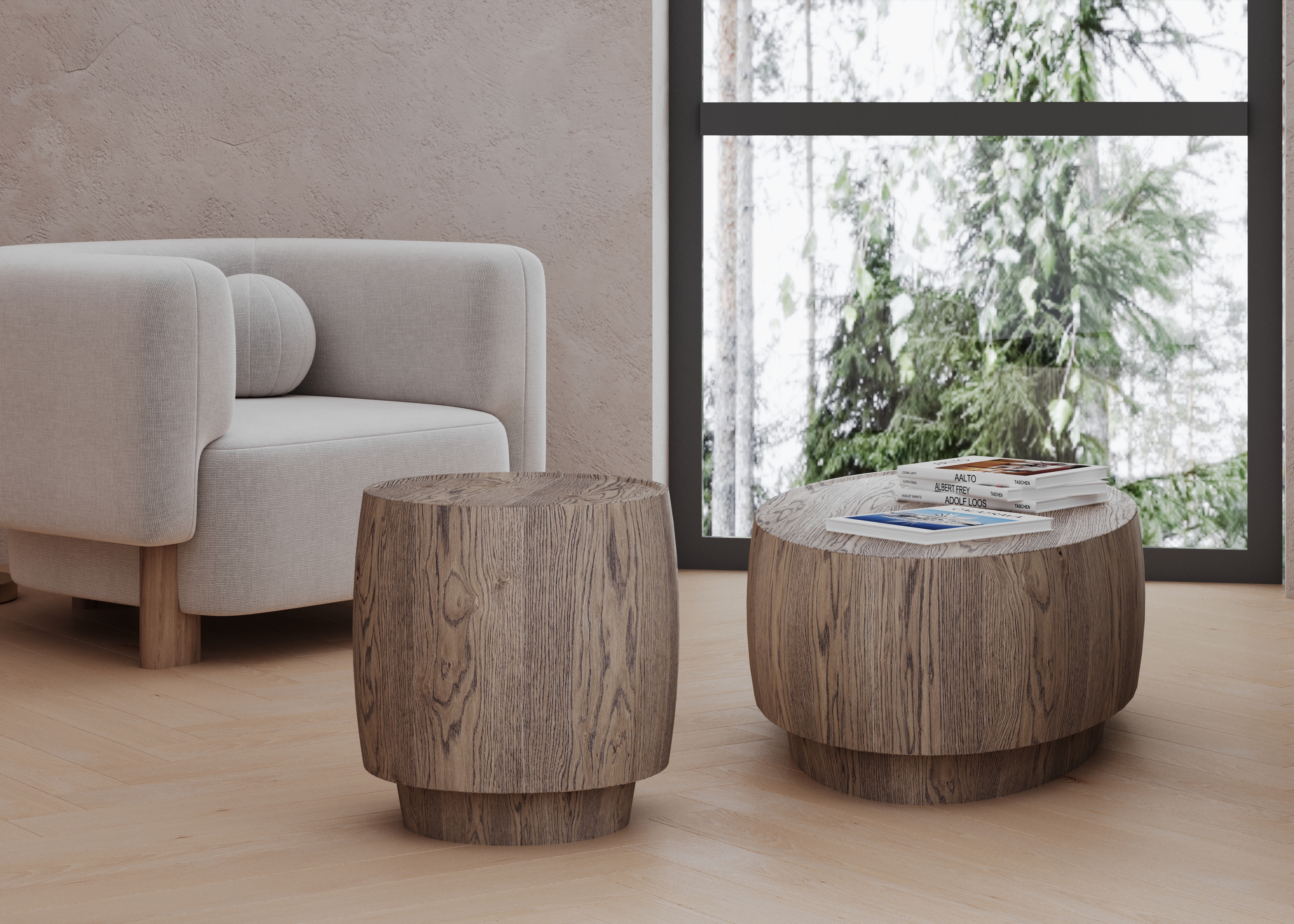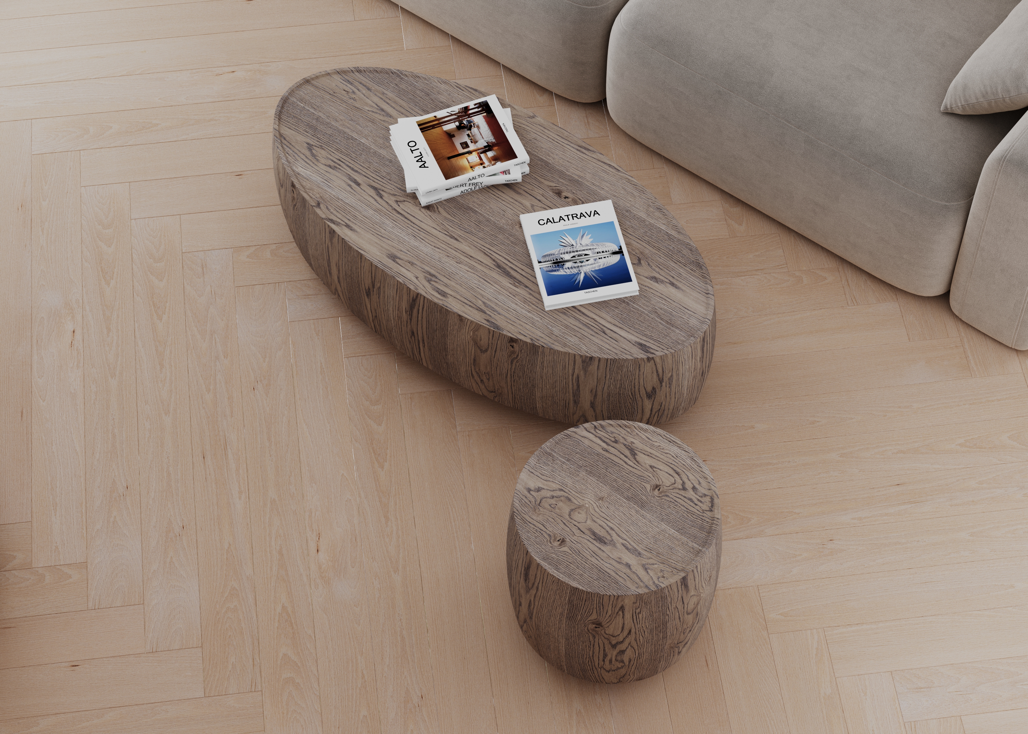 Massive oak coffee tables with stained grain under matt laquer