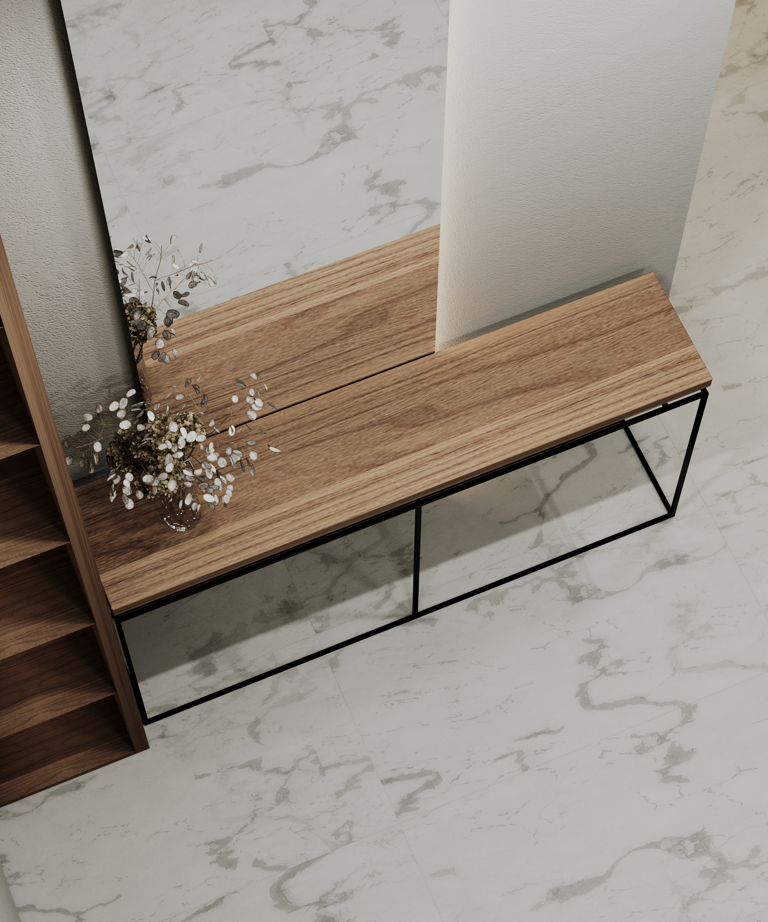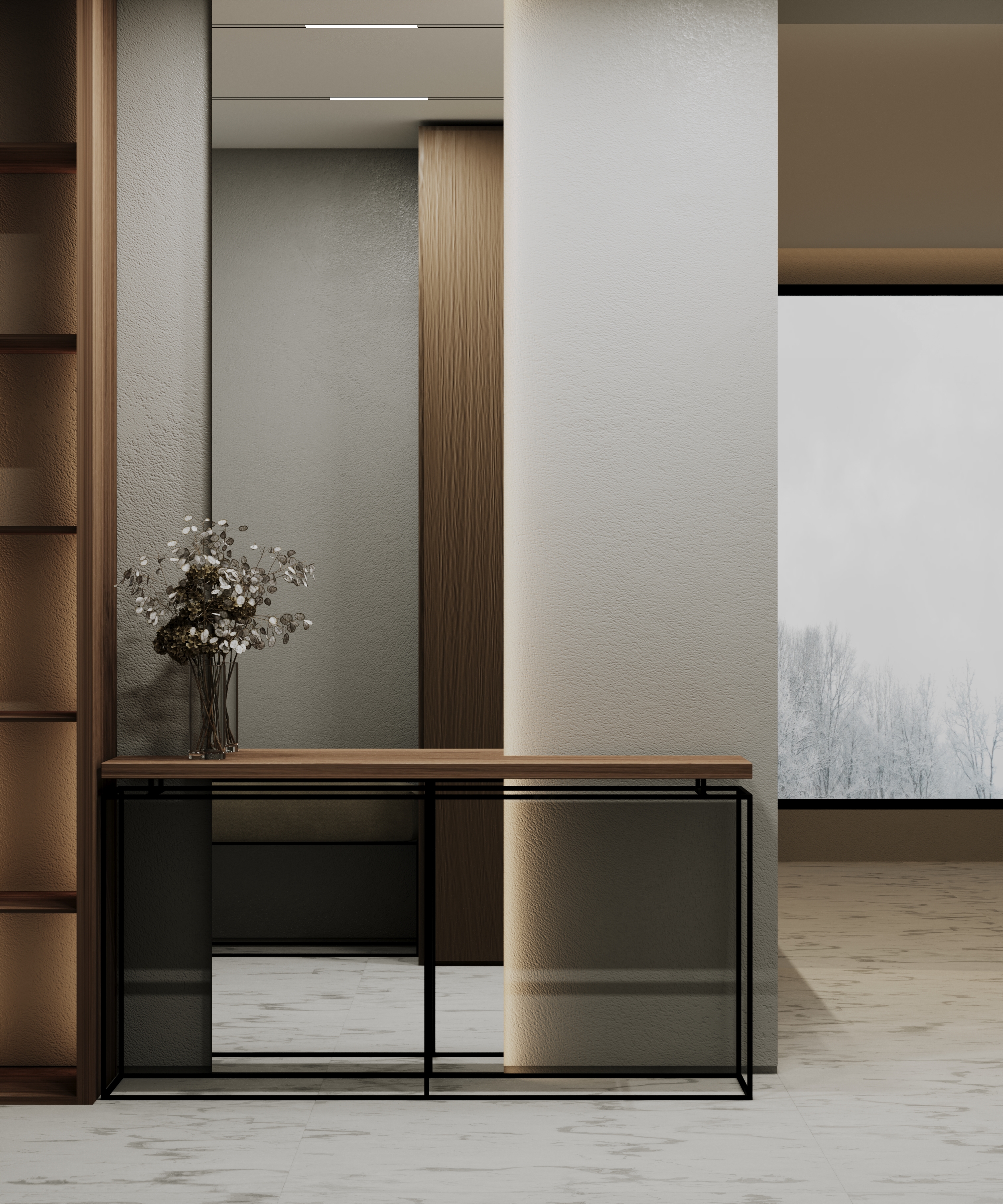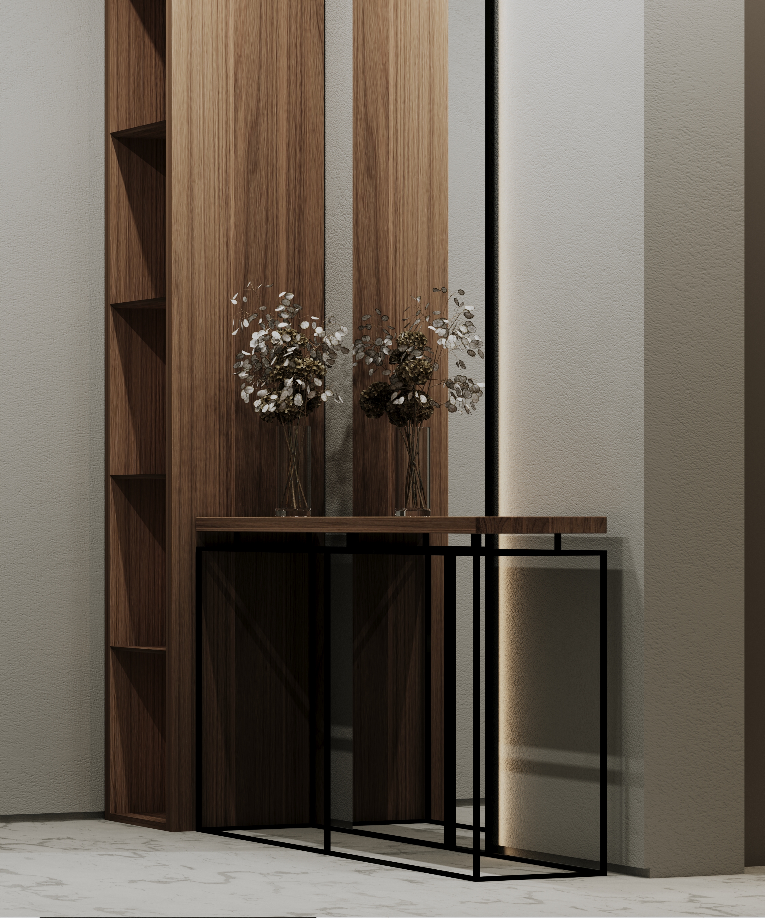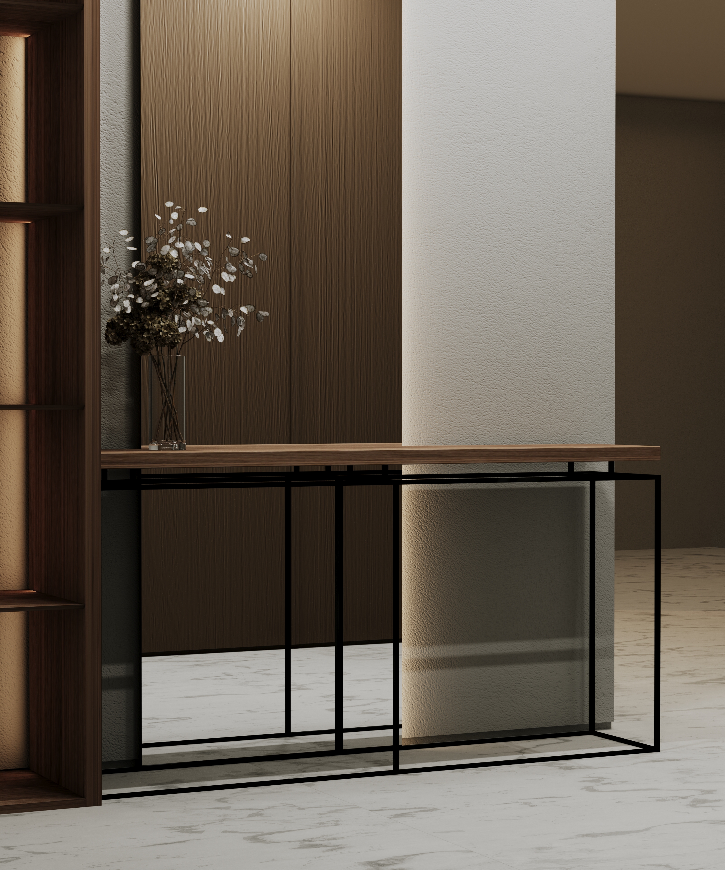 Console for the hallway. The metal frame is painted with powder enamel. The wooden tabletop is made of solid walnut.